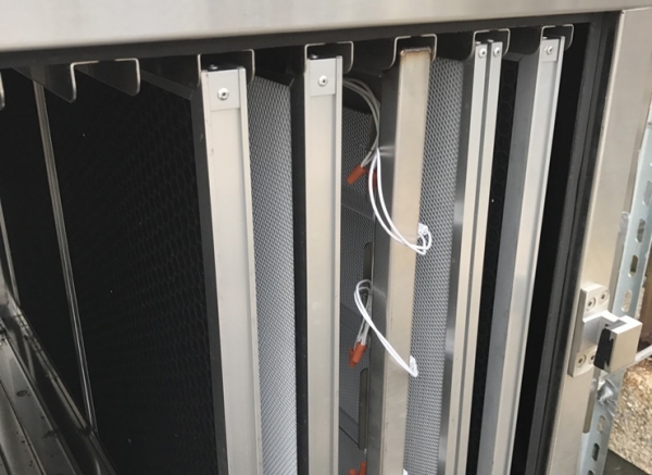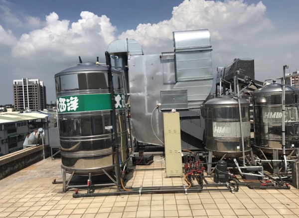 江豪記總店位於建工路上,因臭豆腐所產生的味道比較重,我們就曾因為油煙問題,屢遭民眾投訴,甚至因此搬了九次店面,所以開始研發油煙處理系統(此套設備:靜電處理機、UVC燈管、光觸媒版、活性碳、臭氧機、廢氣洗滌塔、風車、空壓機),把油煙和臭味, 稀釋排除,如今這套系統並成功解決了店家的問題。